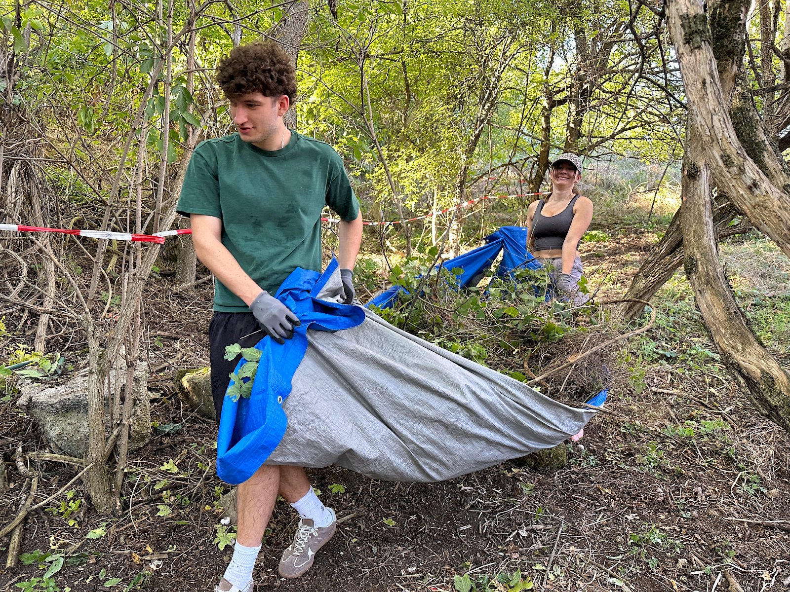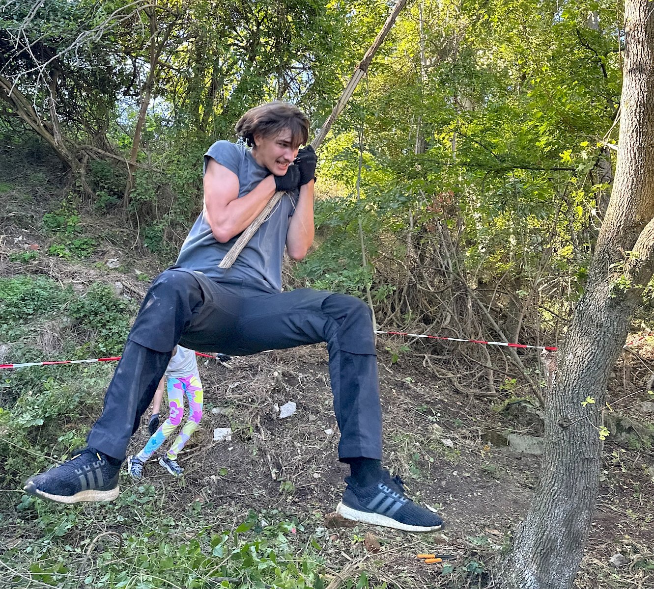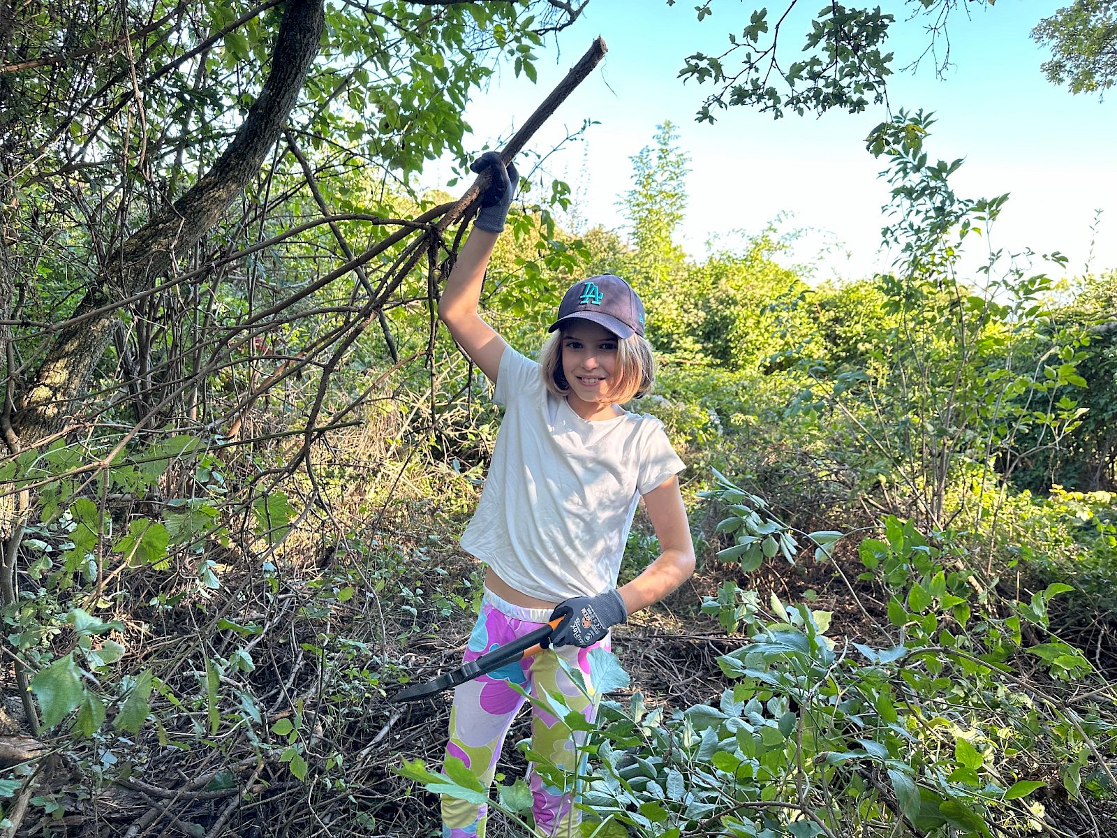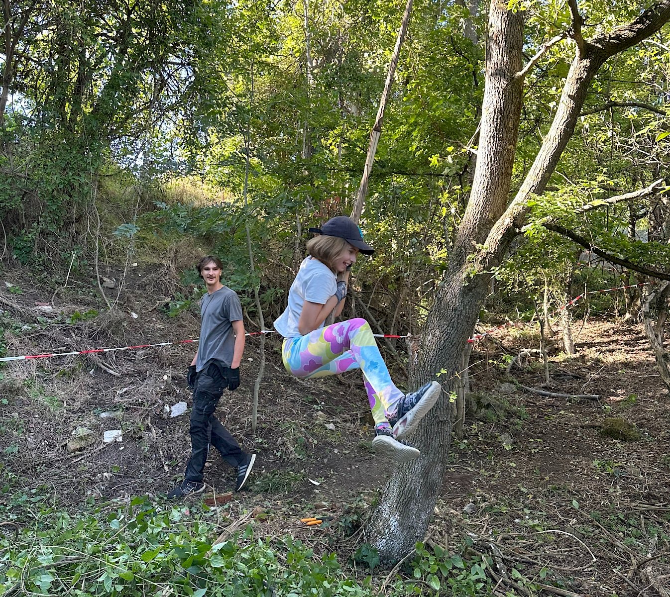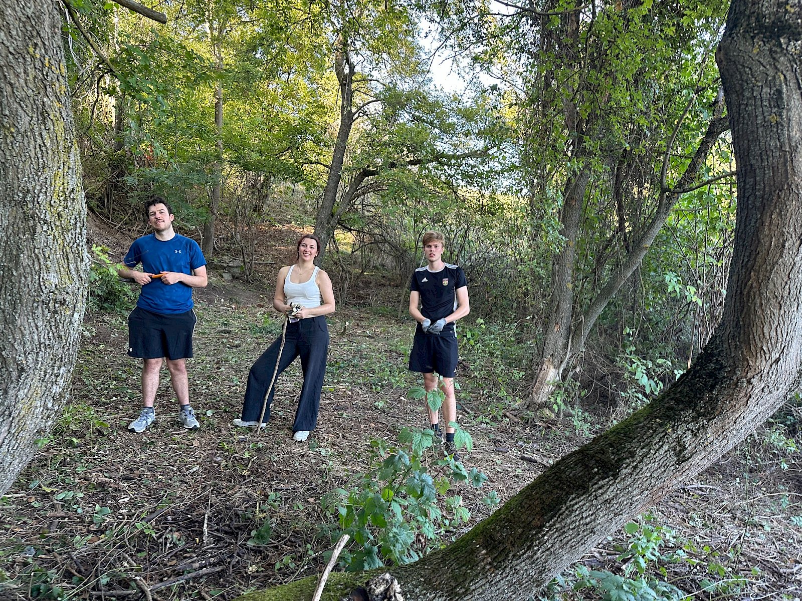 Die jungen Sportler bekamen heute eine besonders anspruchsvolle Aufgabe: im Bereich der kleinen Heide sollte ein Beweidungskorridor für die Schafe von Schäferin Christa Veits entstehen. Dichtes Buschwerk, teilweise mit starken Dornen musste dabei entfernt werden. Die teilweise stark wuchernden Waldreben erschwerten die Arbeit, inspirierten aber auch zu Spiel und Spaß: starke Triebe wurden als Lianen zum Schwingen verwendet und so der Nachmittag aufgelockert.