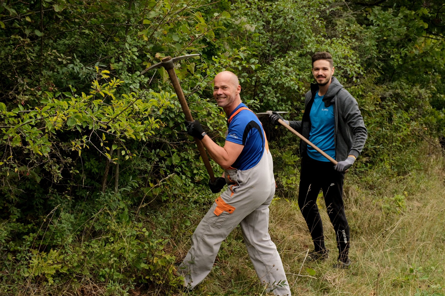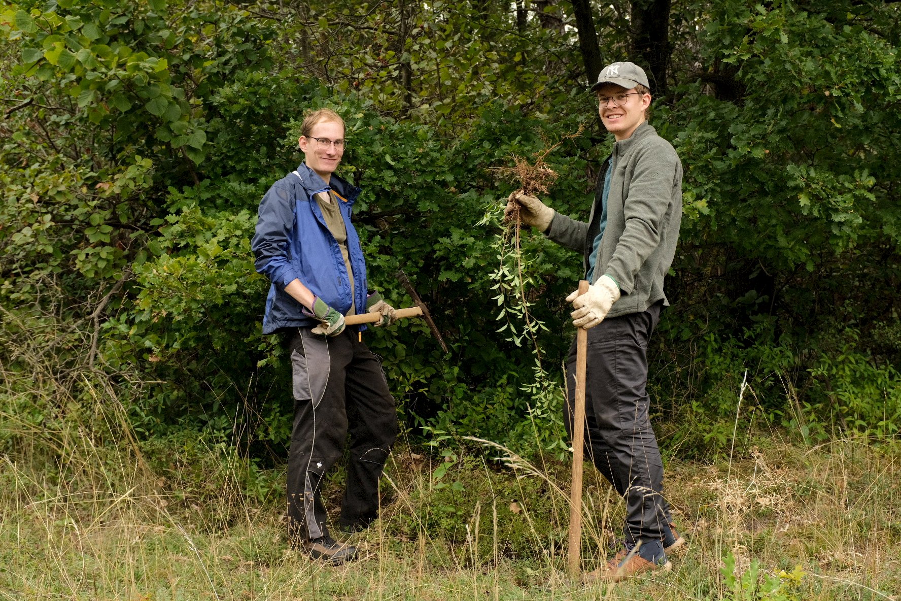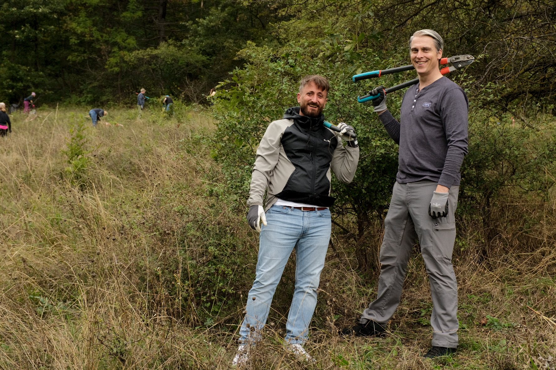 Wieder ließ uns das Wetter - bei wirklich schlechter Vorhersage - nicht im Stich. Statt angesagtem Dauerregen nieselte es ganz kurz zwischendurch, was bei der Arbeit nicht störte. Bei der Entbuschung im Saugraben waren 26 Erwachsene mit dabei, am Nachmittag 26 Erwachsene und ein Kind. Voll motiviert packten diesmal eine 5-köpfige Gruppe der UNIQA Österreich Versicherungen AG (Value Train Krankenversicherung) mit Leiter Franz Schaden sowie eine 13-köpfige Gruppe der Erste Group Services GmbH (Finance Subsidiaries Leasing) mit Leiter Johannes Tretzmüller an. Krampen wurden fleißig geschwungen und zahlreiche Liguster ausgehackt. Eichen und Haseln ging es mit den Scheren ans Holz. Am Ende des Tages war der obere Teil des Saugrabens perfekt entbuscht - sprich alle Gebüsche entfernt, die nicht stehen bleiben sollten.