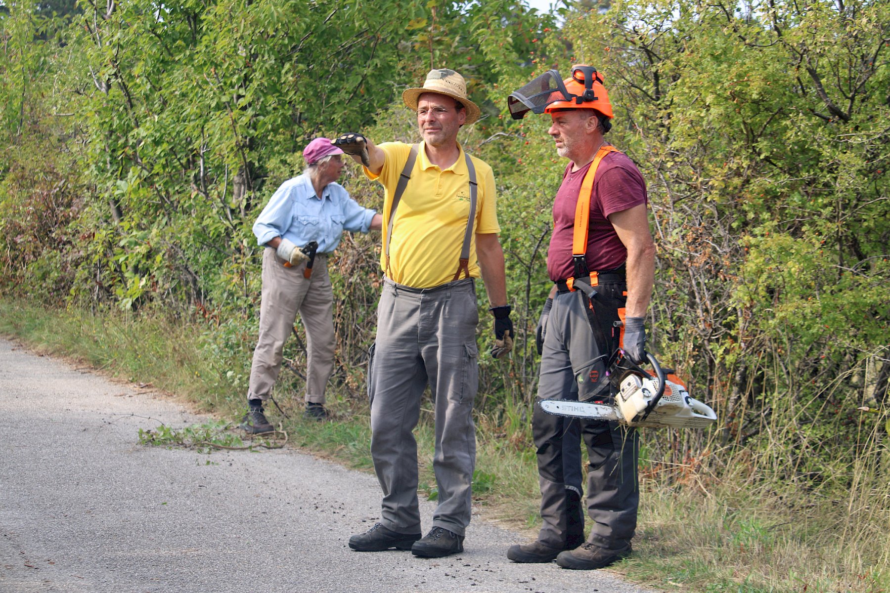 Der Regen hörte um ca. 8Uhr auf, trotzdem waren die Trockenrasen natürlich nass. Daher ging es ans sowieso schon länger geplante Ausschneiden, Zurücksetzen und Verkleinern der Hecken und Gebüsche entlang der Heidestraße. Schöne Trockenrasenböschungen wurden wieder vollständig freigestellt, teilweise die Hecken auf Hüfthöhe zurückgesetzt, in machen Bereichen verschmälert, wo sie schon zu weit in die Trockenrasen hineinwachsen, bestimmte Gehölze geringelt, damit sie absterben und mit Stockausschlägen nicht noch mehr Arbeit machen, Lehrpfadtafeln freigestellt und Sichtfenster auf die Heidelandschaft an passenden Stellen in die Hecke geschnitten. So entstanden vier riesige Schnittguthaufen, die nächste Woche vom Wirtschaftshof der Gemeinde abgeholt werden. Zum Schluss wurde die Straße noch besenrein gemacht.