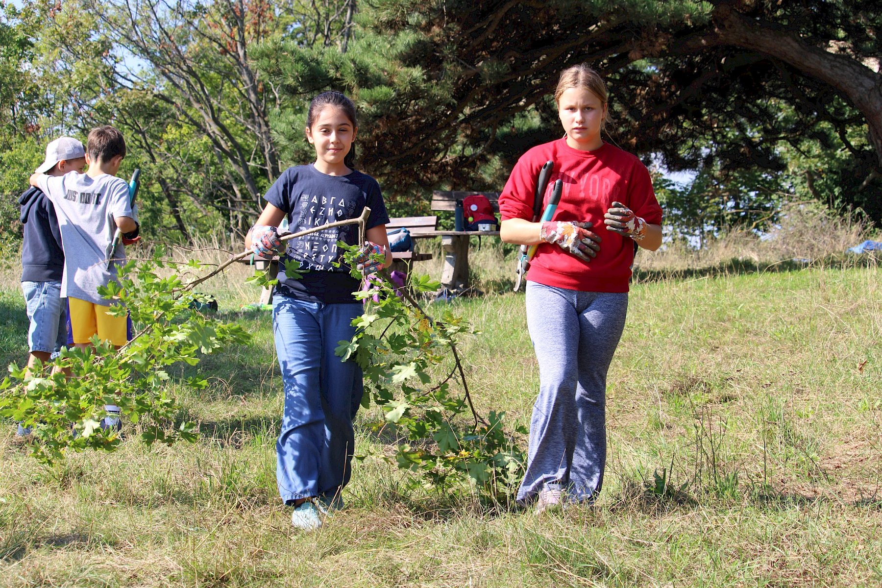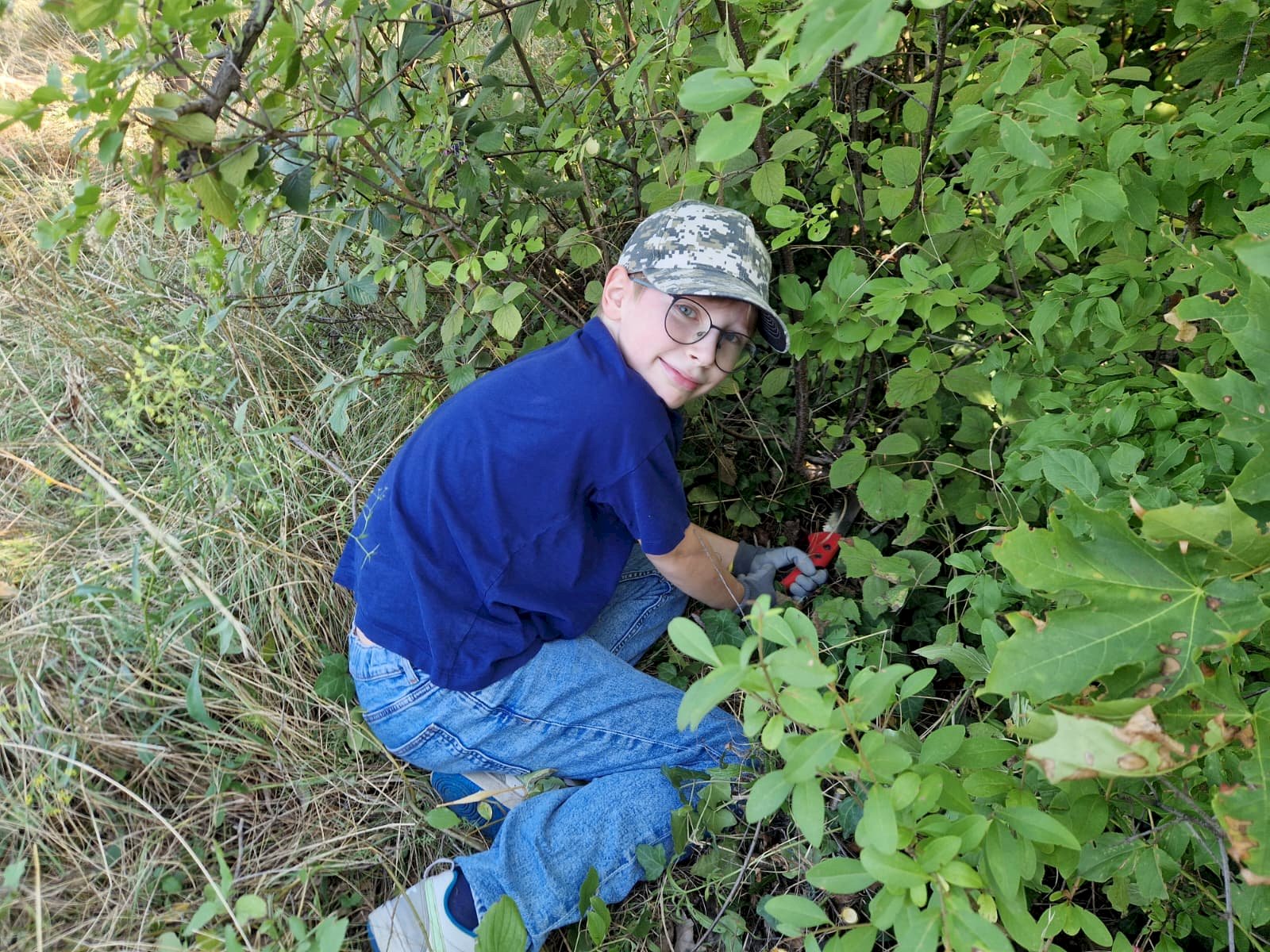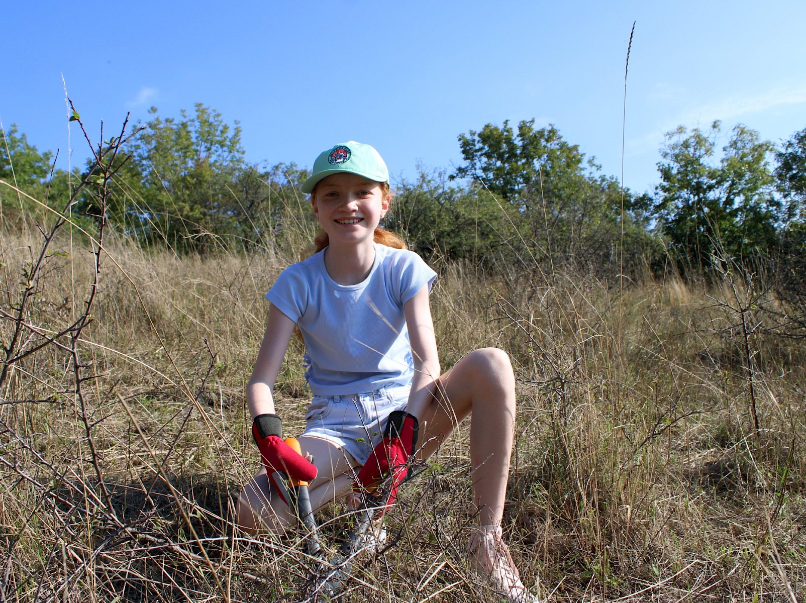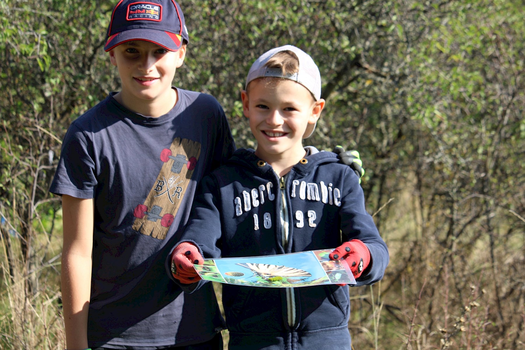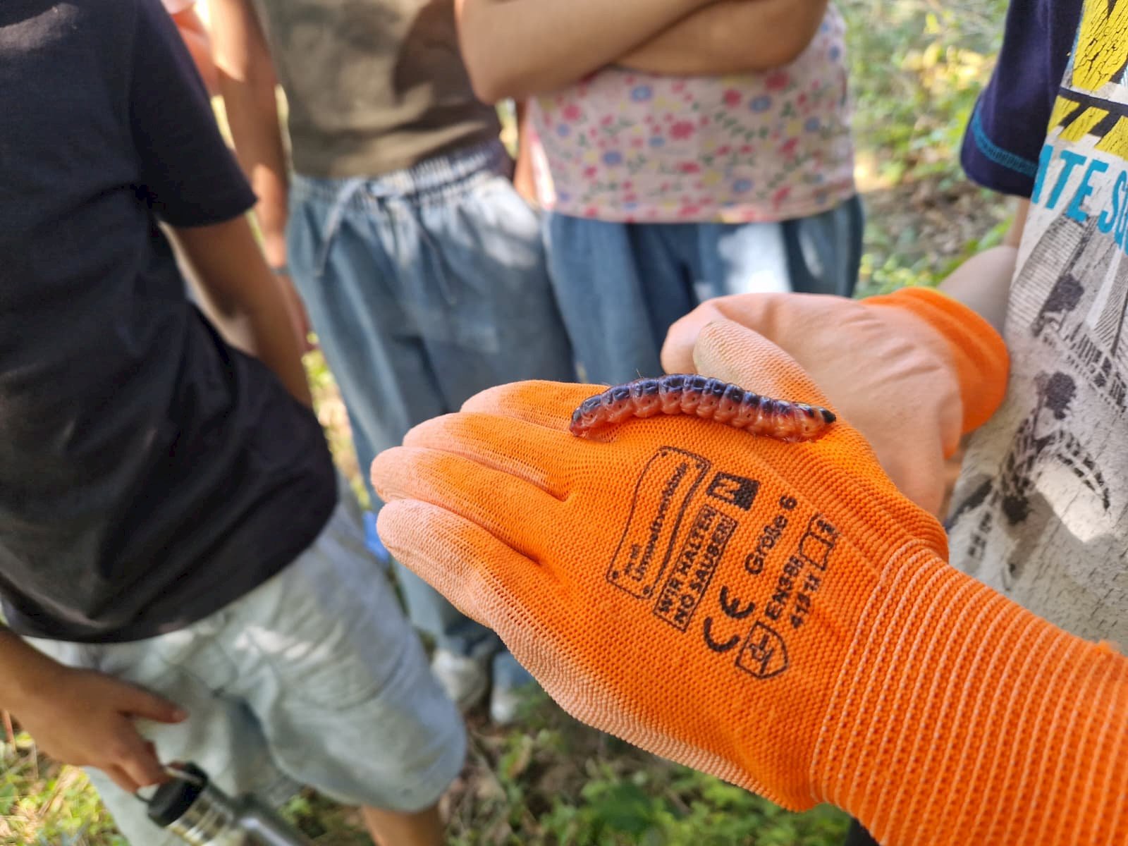 Ausgerüstet mit Astscheren ging es heute darum, den Waldrand zurückdrängen und aufkommende Gehölze abzuschneiden. Bei dickeren Ästen und Gehölzen wie z.B: Goldregen wurde auch mit Sägen gearbeitet. Die zahlreichen Schlehen auf der Fläche wurden ausgelichtet. Dabei ist es wichtig, auch einige davon stehen zu lassen, da sie wichtige Lebensräume für viele Arten sind. Der Segelfalter (Iphiclides podalirius) ist unter anderem auf das Vorhandensein der Sträucher angewiesen. Sie dienen ihm als Kinderstube, was auch gleich mit dem Fund einer Segelfalter-Raupe bewiesen wurde. Sie wurde sogleich von den Kindern "Friedrich" getauft! Neben der Arbeit wurden auch Gottesanbeterinnen (Mantis religiosa) und ihre Gelege, Eichengallen und die beeindruckende Raupe eines Weidenbohrers (Cossus cossus) bestaunt.