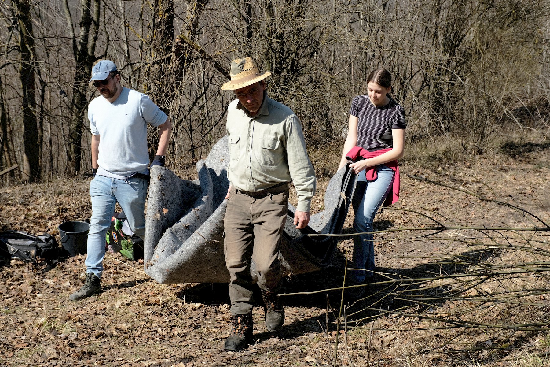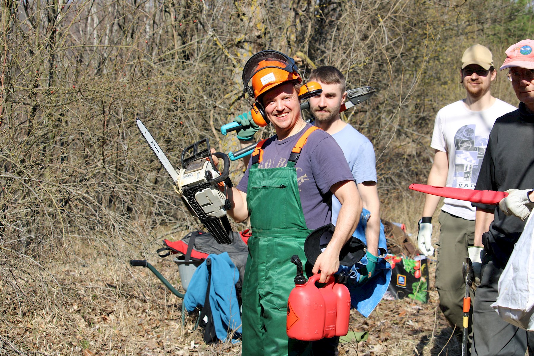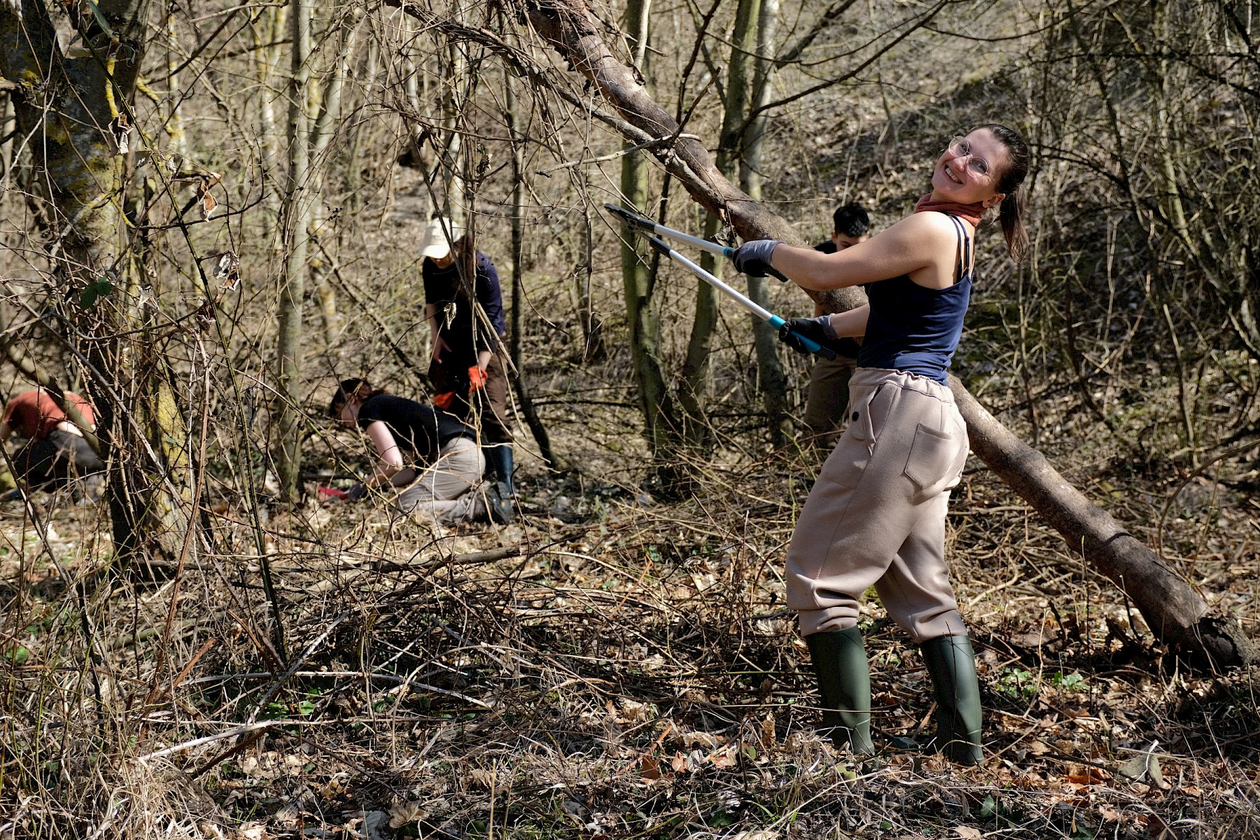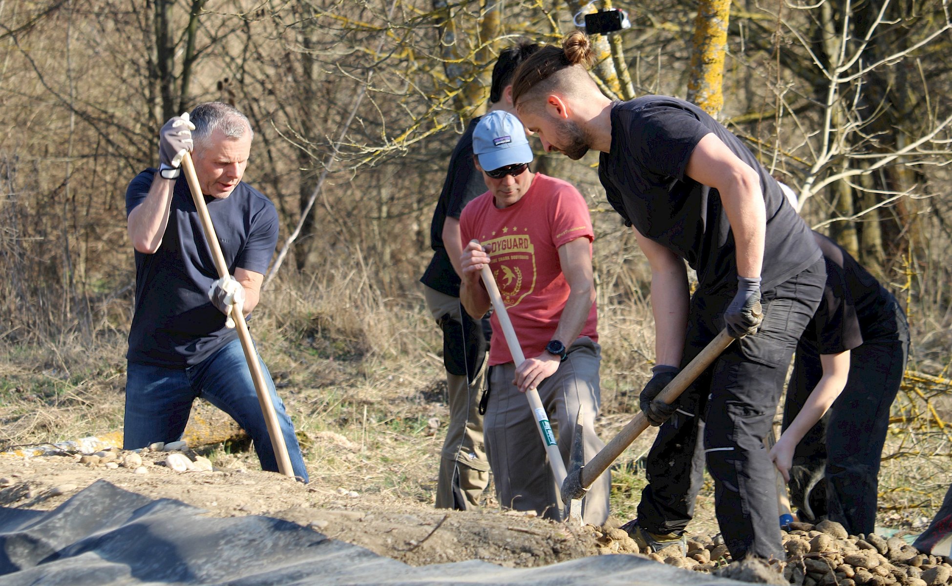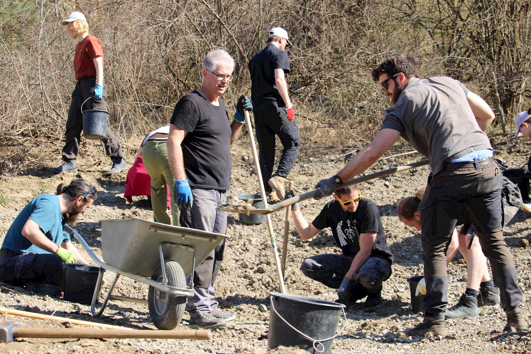 Während der Arbeiten am Teich machten sich verschiedene Gruppen daran, anderweitige Arbeiten im Gebiet zu erledigen. So wurden einzelne Gehölze entfernt, um die Landschaft für wärmeliebende Arten offen zu halten, Kies für einen zukünftigen Tümpel umgeschlichtet und einen kleinen Bestand des invasiven, nicht heimischen Japanischen Staudenknöterichs (Fallopia japonica) mittels Teichfolie zum Absterben zu bringen, wofür zuerst einzelne Gehölze entfernt werden mussten.