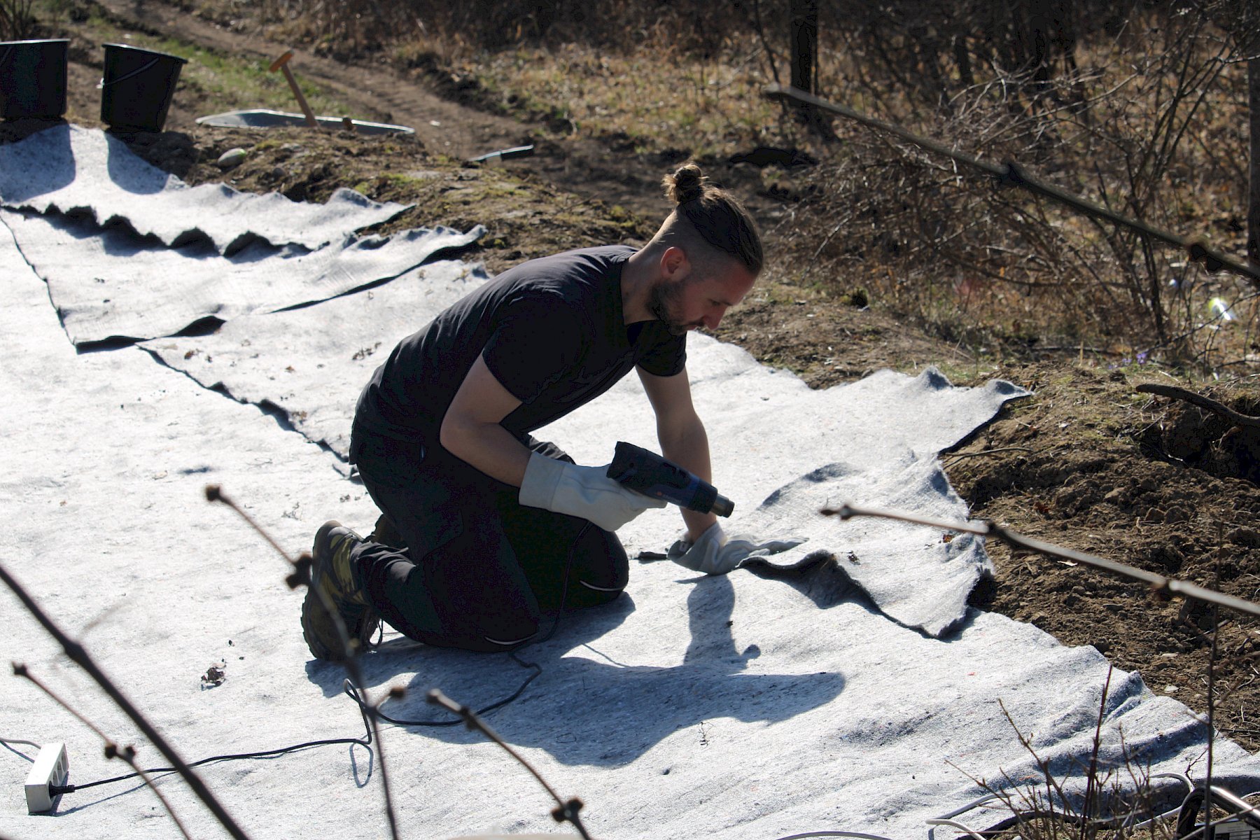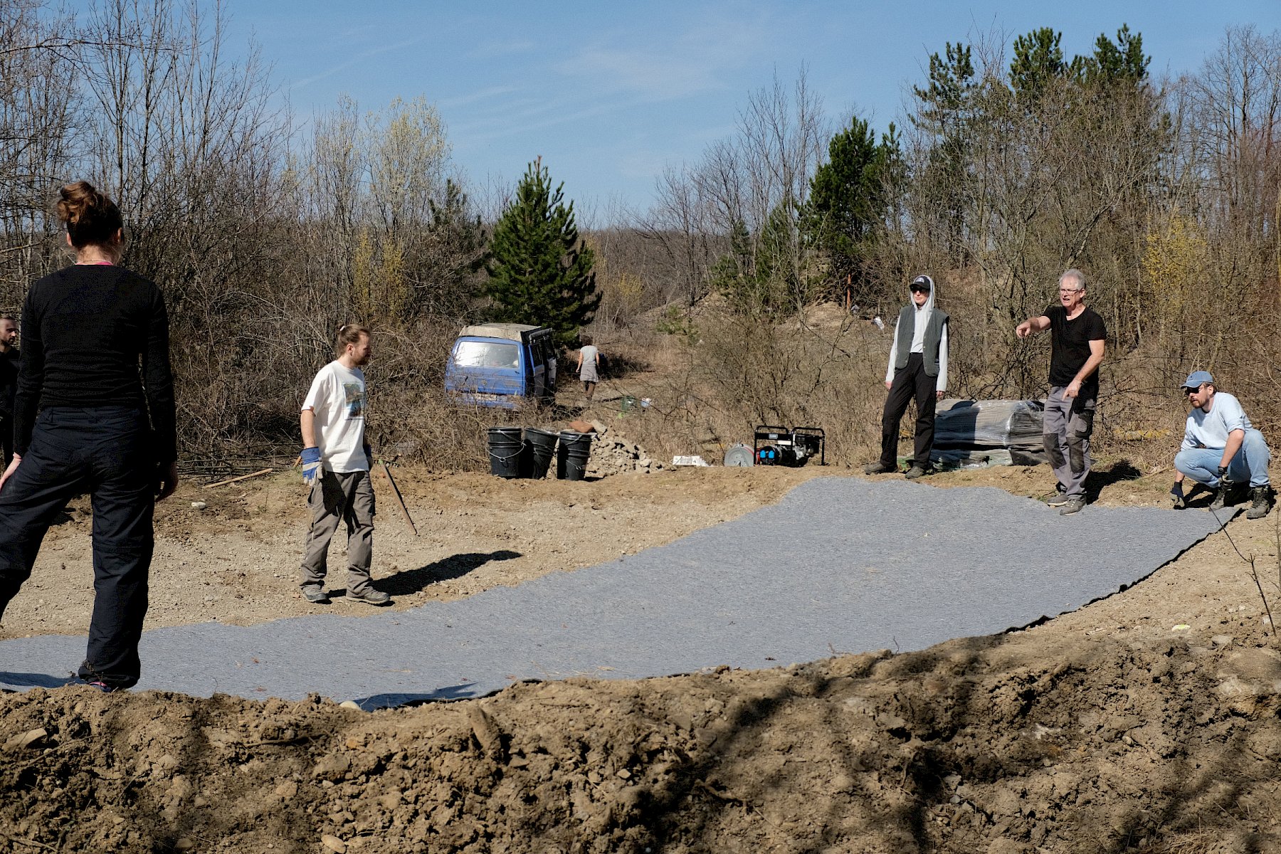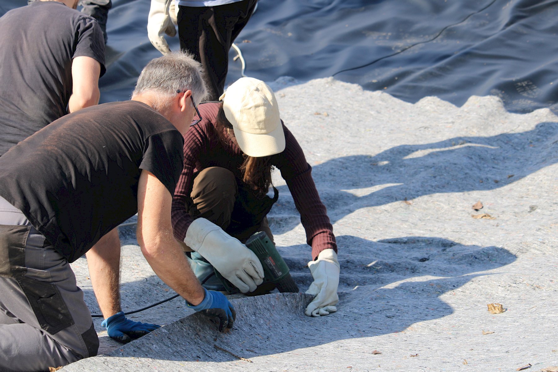 Nachdem der Boden der Grube entsprechend vorbereitet worden war, wurde zunächst eine Schicht Vlies ausgerollt und die Vliesbahnen mithilfe von Heißluftpistolen an den Seiten verschweißt. Nach der verdienten Mittagspause wurde auf diese erste Vliesschicht anschließend die eigentliche Teichfolie gelegt, wobei für das Auflegen dieser Folie auf Grund des hohen Gewichts der Großteil der Anwesenden gleichzeitig anpacken musste. Auf diese Folie wurde danach noch eine weitere Schicht Vlies verlegt, die ebenfalls verschweißt wurde.