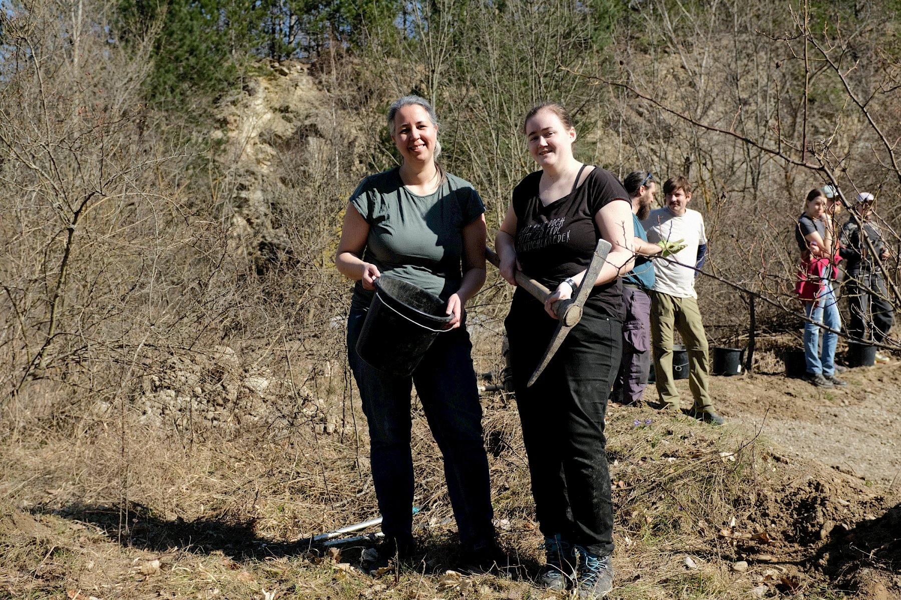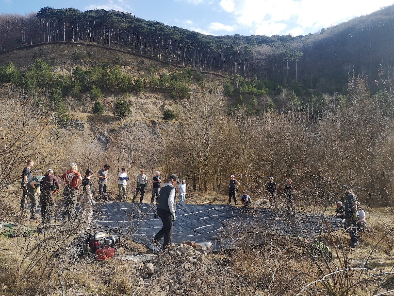 Bei sonnigem Wetter machten sich heute 34 Freiwillige am Vormittag und 32 Freiwillige am Nachmittag mit Krampen, Scheren, Schaufeln und Rechen an die Arbeit, um einen Amphibientümpel im Naturschutzgebiet Teufelstein-Fischerwiesen in Kaltenleutgeben zu errichten. Dabei waren Biolog:innen und freiwillige Helfer:innen von Heideverein und Landschaftspflegeverein, LPV-Praktikant:innen und Freiwillige der Österreichischen Gesellschaft für Herpetologie (ÖGH) im Einsatz. Auch gf. Gemeinderätin für Biodiversität Agnes Wühr sowie Umweltgemeinderätin Claudia Wolfert (Marktgemeinde Perchtoldsdorf) waren mit dabei. Der Wirtschaftshof der Gemeinde Perchtoldsdorf hatte Folie und Vlies zwischengelagert und ins Gebiet transportiert.
