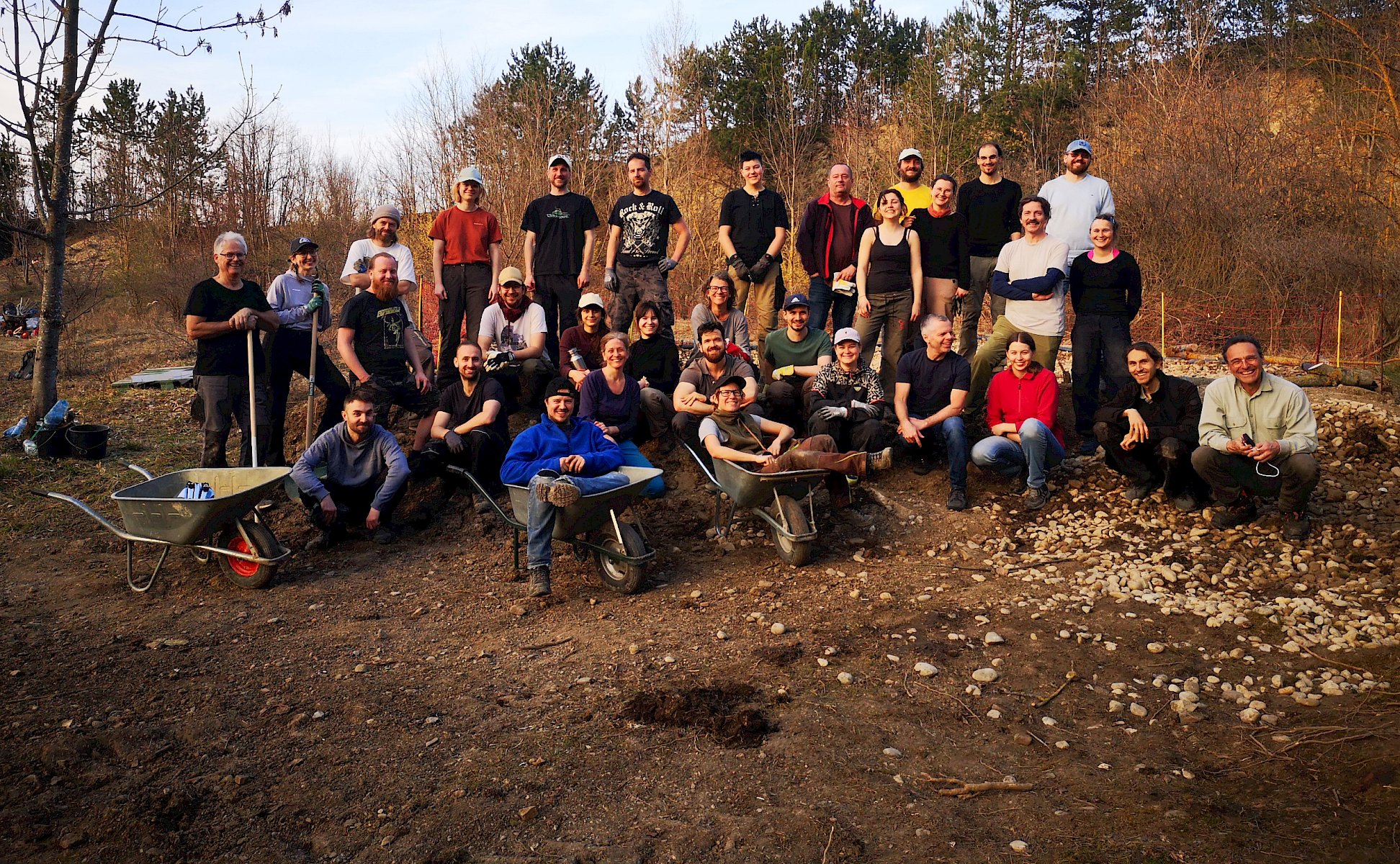 Anschließend wurde der grobe Kies mithilfe von Kübeln und Scheibtruhen gleichmäßig auf der Fläche des zukünftigen Tümpels verteilt. Durch die vielen Helfer:innen ging diese schwere Arbeit zum Glück rasch voran. Zum Abschluss wurde rund um den Tümpel einen Zaun aufgestellt, der am Boden zusätzlich mit den Stämmen der am Vormittag gefällten Gehölze verstärkt wurde. So wird sichergestellt, dass die im Gebiet vorkommenden Wildschweine den zukünftigen Amphibienlaichplatz nicht stören.