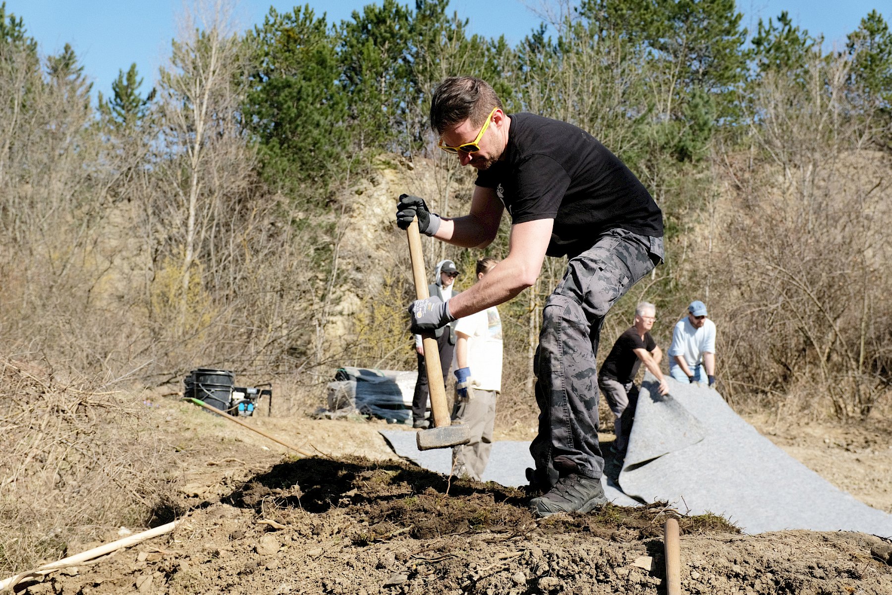 Zur Vorbereitung der Arbeiten schnitt unser Biologe Alex zunächst einige Gehölze rund um die Grube des späteren Teiches. In einem ersten Arbeitsschritt war bereits unter Anleitung von Biologin Irene vor einigen Wochen mit einem Bagger eine flache Grube ausgehoben und geformt worden. Der nächste Arbeitsschritt bestand darin, aus dem Bett größere Steine zu entfernen und den noch unebenen Untergrund mithilfe von Krampen zu glätten und zu ebnen.