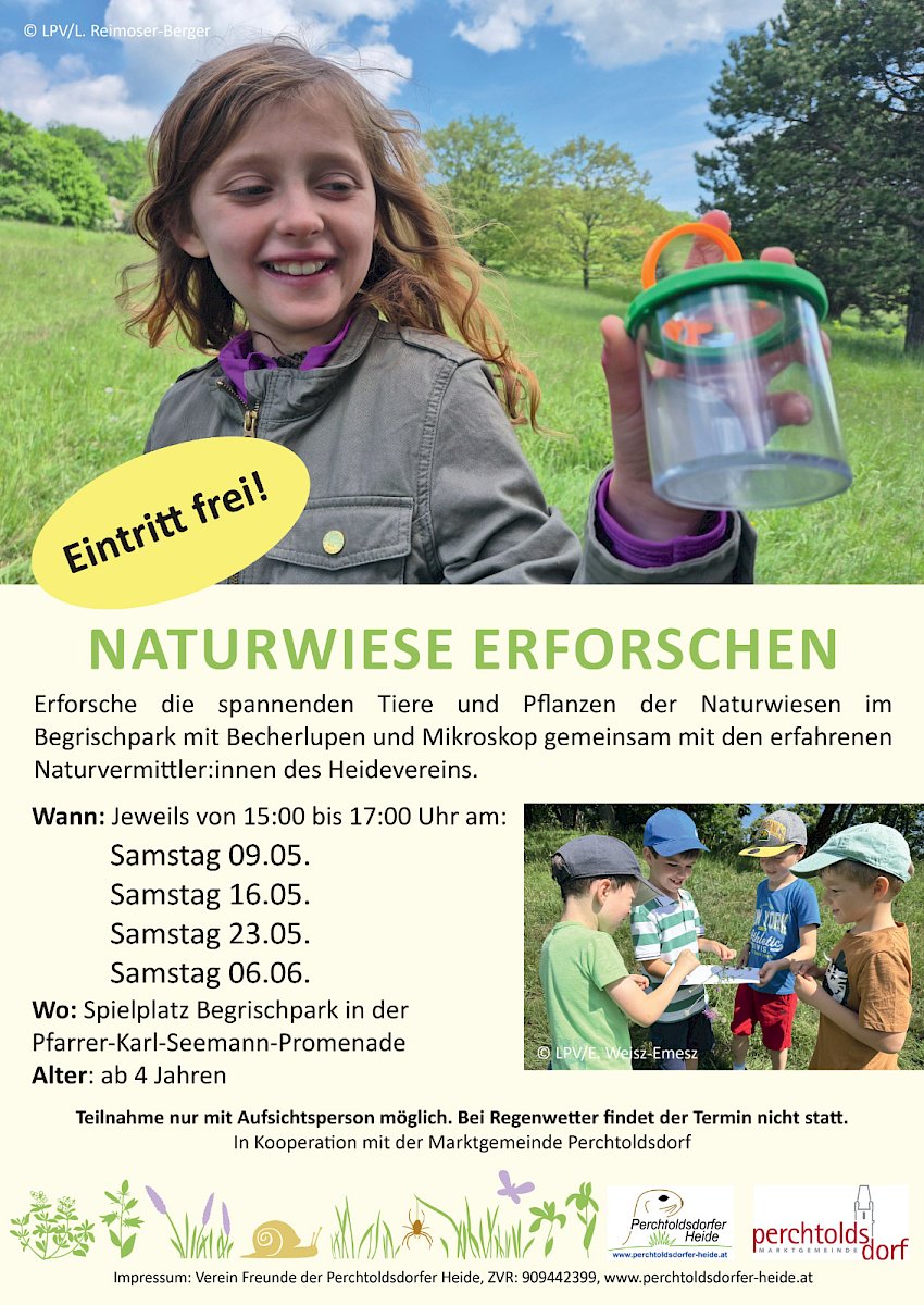 Erforsche die spannenden Tiere und Pflanzen der Naturwiesen im Begrischpark mit Becherlupen und Mikroskop gemeinsam mit den erfahrenen Naturvermittler:innen des Heidevereins. Geeignet für Kinder ab 4 Jahren.